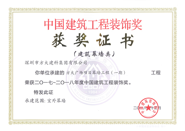 中國建筑工程裝飾獎是由中國建筑裝飾協會主辦的評選活動,自2001年起每年進行評選,是建設部批準設立的中國建筑裝飾行業的最高榮譽獎。方大建科承建的四項幕墻工程獲此獎項,是對公司精湛的幕墻設計能力和先進的施工工藝的充分肯定。