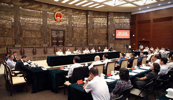 最高人民法院黨組成員孫華璞主持座談會。最高人民法院院領導李少平、馬世忠、羅東川、楊萬明、劉貴祥出席會議,最高人民法院有關部門負責人,及柳傳志、梁穩根、陳東升、王玉鎖、劉慶峰、張文中、洪崎、王均軍等來自科技、金融、醫藥、教育等不同領域的22位民營企業家參加會議。