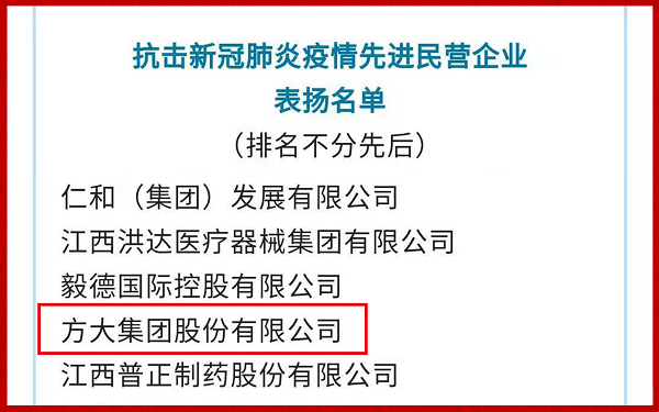 方大集團榮獲全國工商聯“抗擊新冠肺炎疫情先進民營企業”表彰