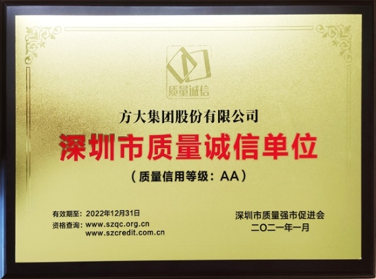 近日,深圳市質(zhì)量強(qiáng)市促進(jìn)會(huì)公布了質(zhì)量誠(chéng)信(示范)單位認(rèn)定名單,方大集團(tuán)獲得“深圳市質(zhì)量誠(chéng)信單位”認(rèn)證。